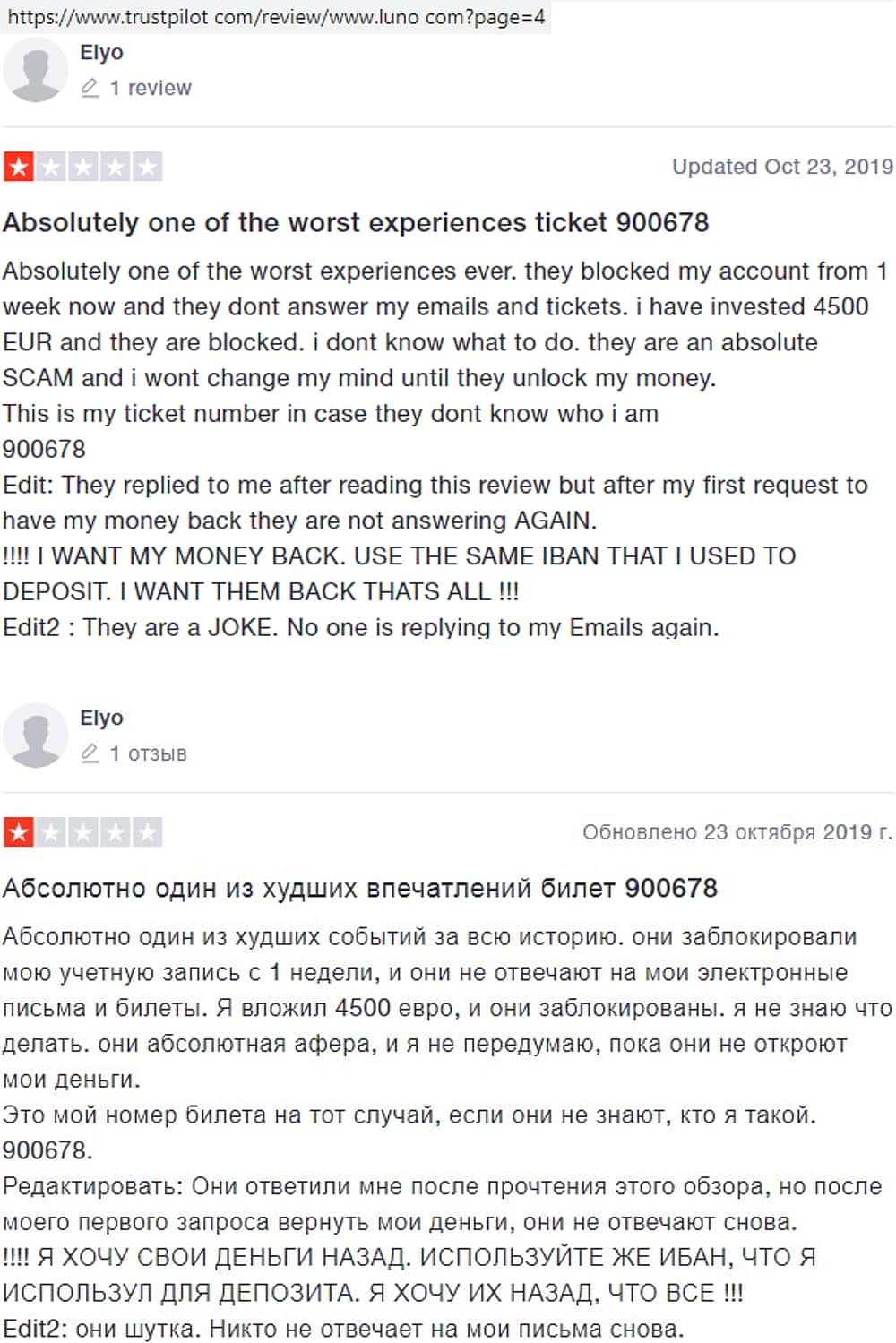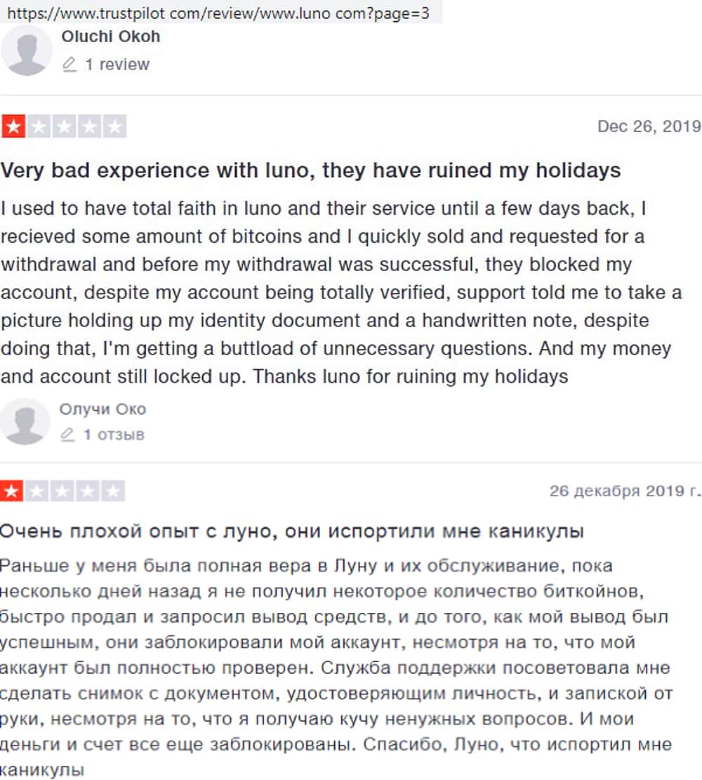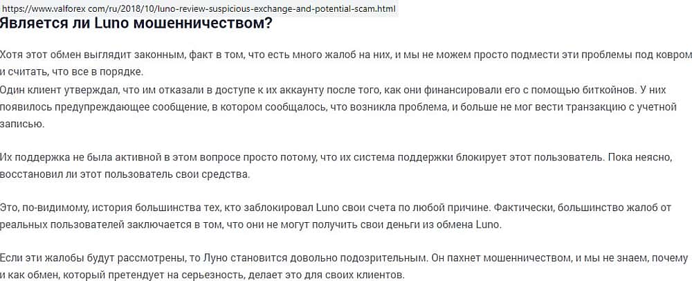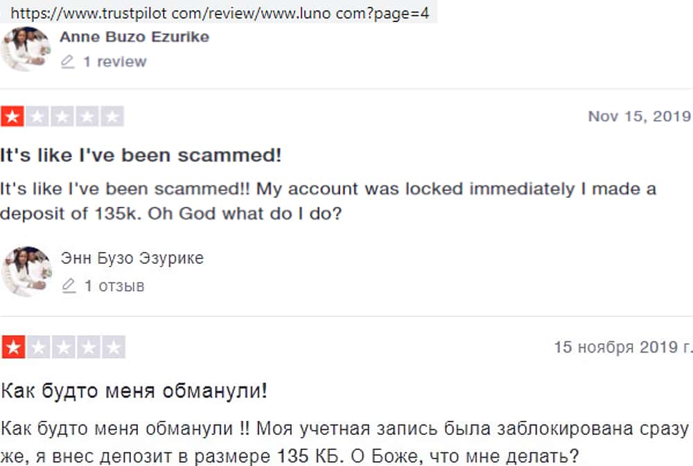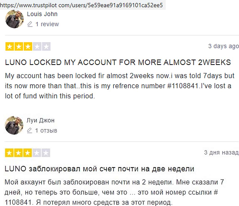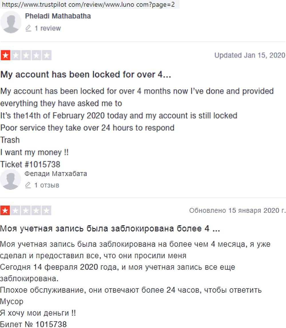 Лишнее подтверждение незаконным действиям аферистом удалось получить, правда на своем на горьком опыте, пользователю сайта отзывов trustpilot com. Не ожидала жертва аферистов Luno, что после внесение ею на депозит кругленькой суммы, ее аккаунт будет быстро заблокирован на веки вечные.