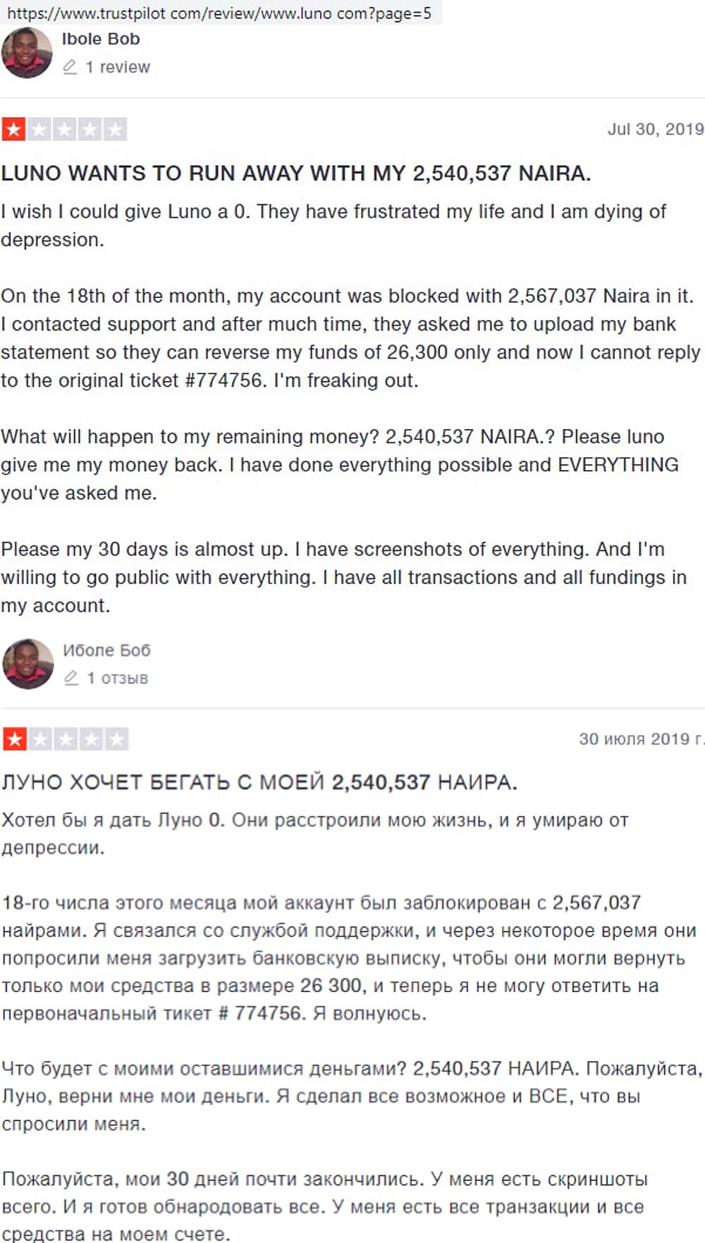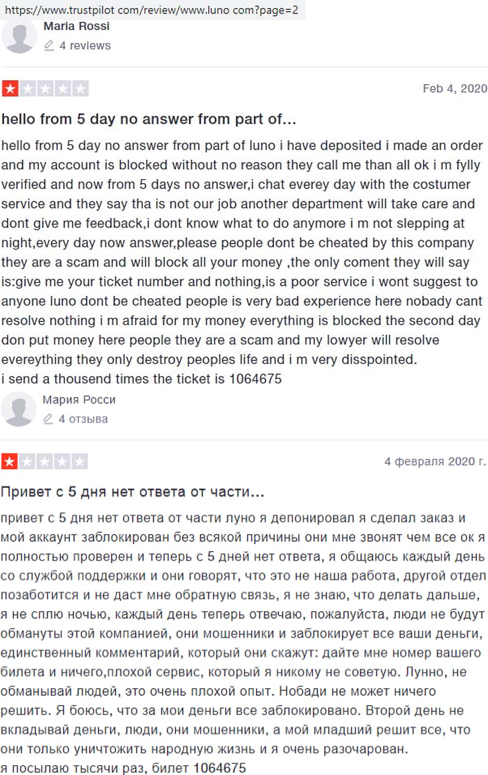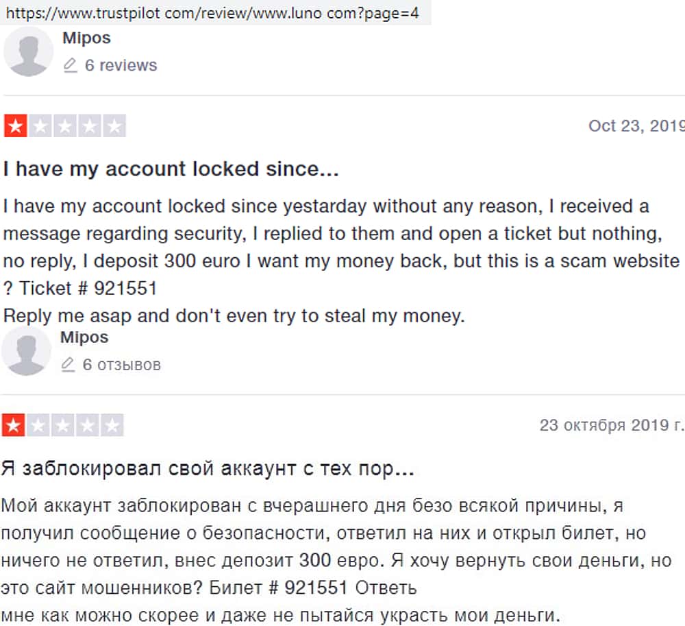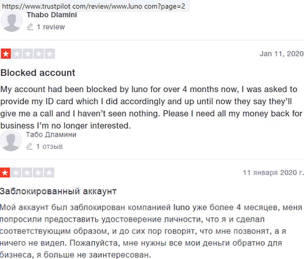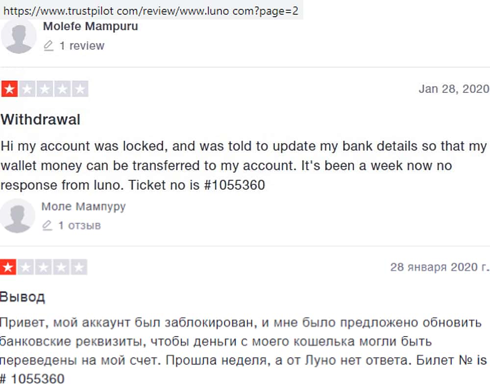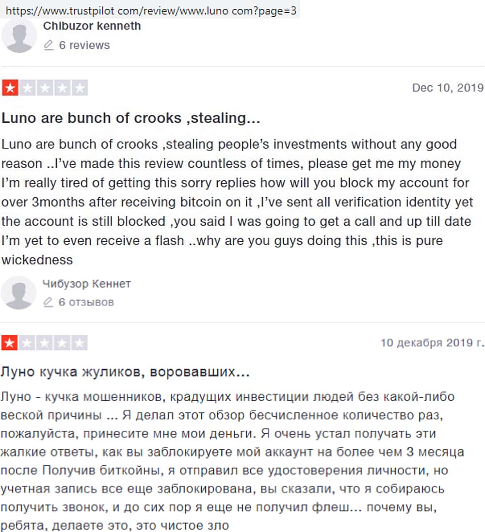 Лишнее подтверждение незаконным действиям аферистом удалось получить, правда на своем на горьком опыте, пользователю сайта отзывов trustpilot com. Не ожидала жертва аферистов Luno, что после внесение ею на депозит кругленькой суммы, ее аккаунт будет быстро заблокирован на веки вечные.