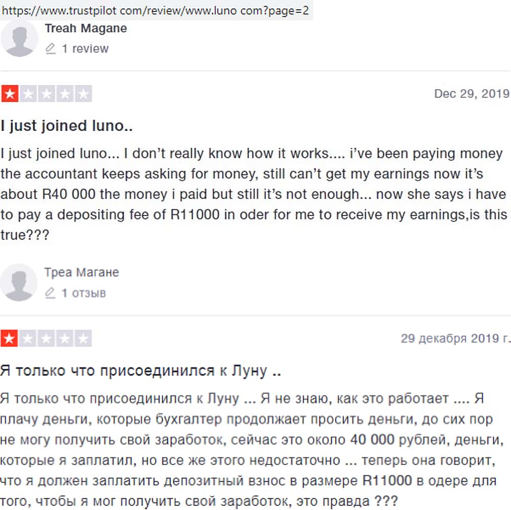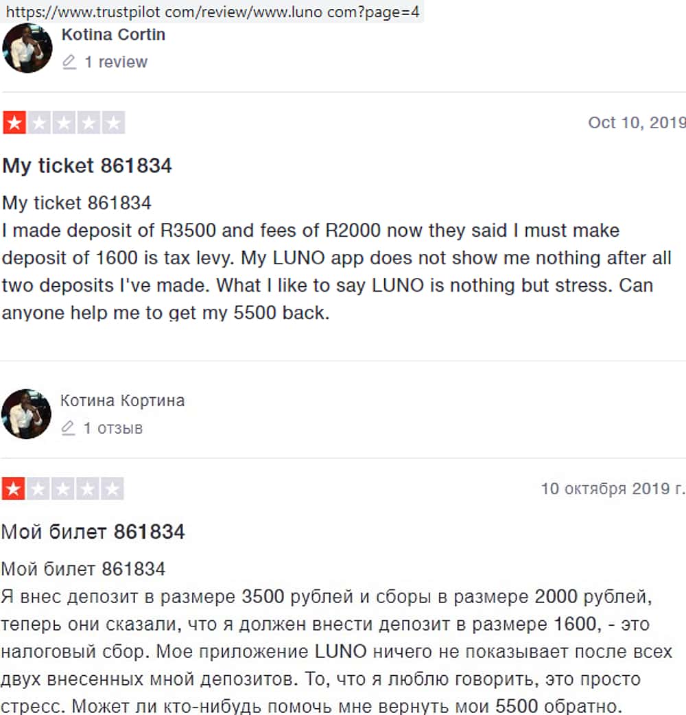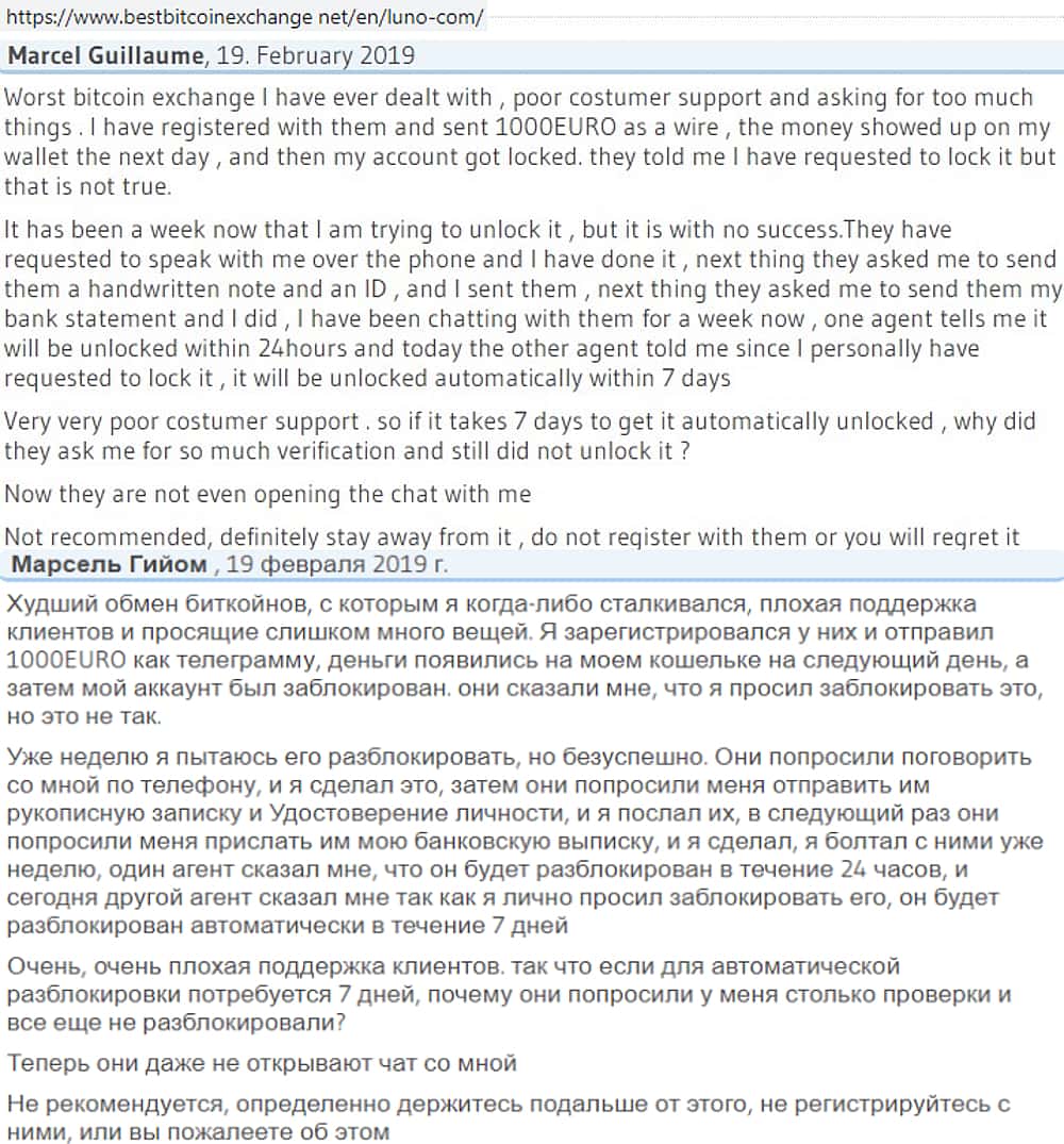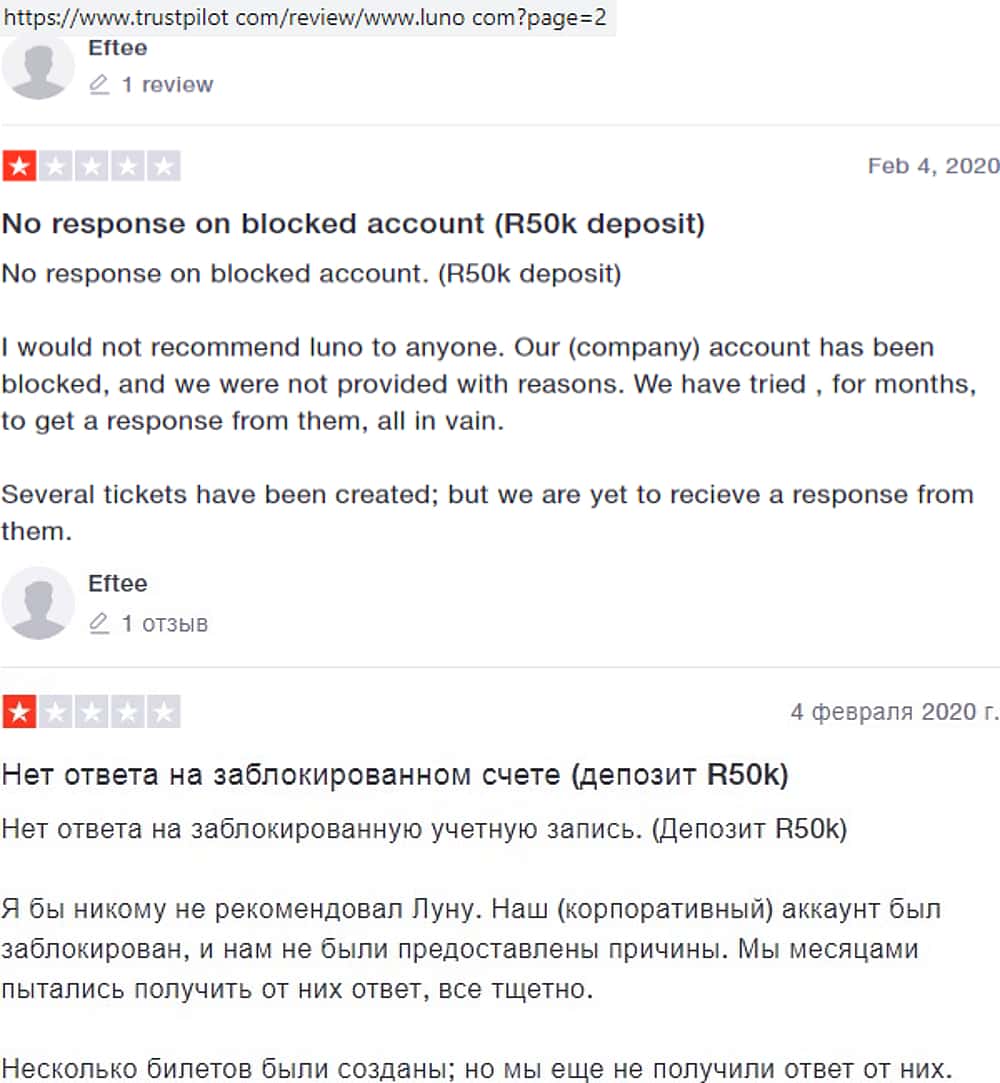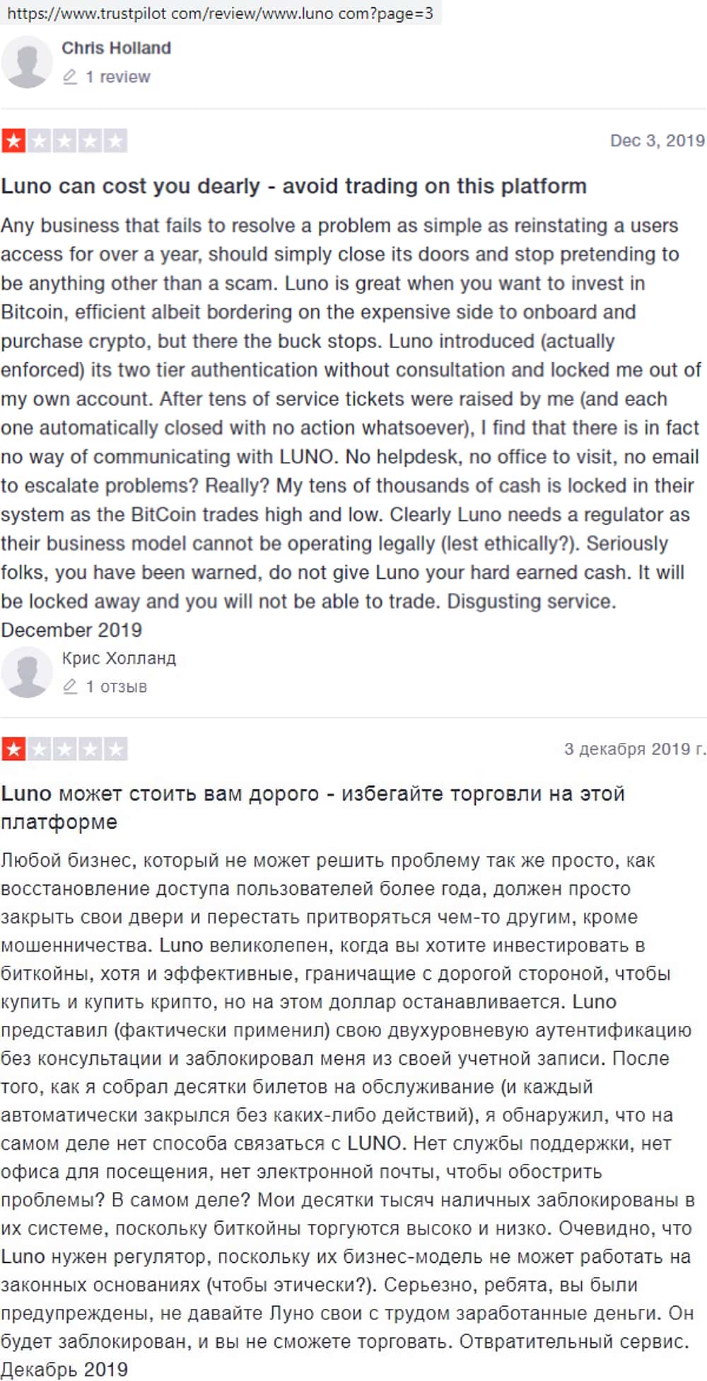 Лишнее подтверждение незаконным действиям аферистом удалось получить, правда на своем на горьком опыте, пользователю сайта отзывов trustpilot com. Не ожидала жертва аферистов Luno, что после внесение ею на депозит кругленькой суммы, ее аккаунт будет быстро заблокирован на веки вечные.
