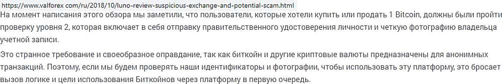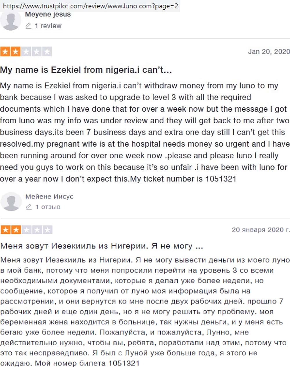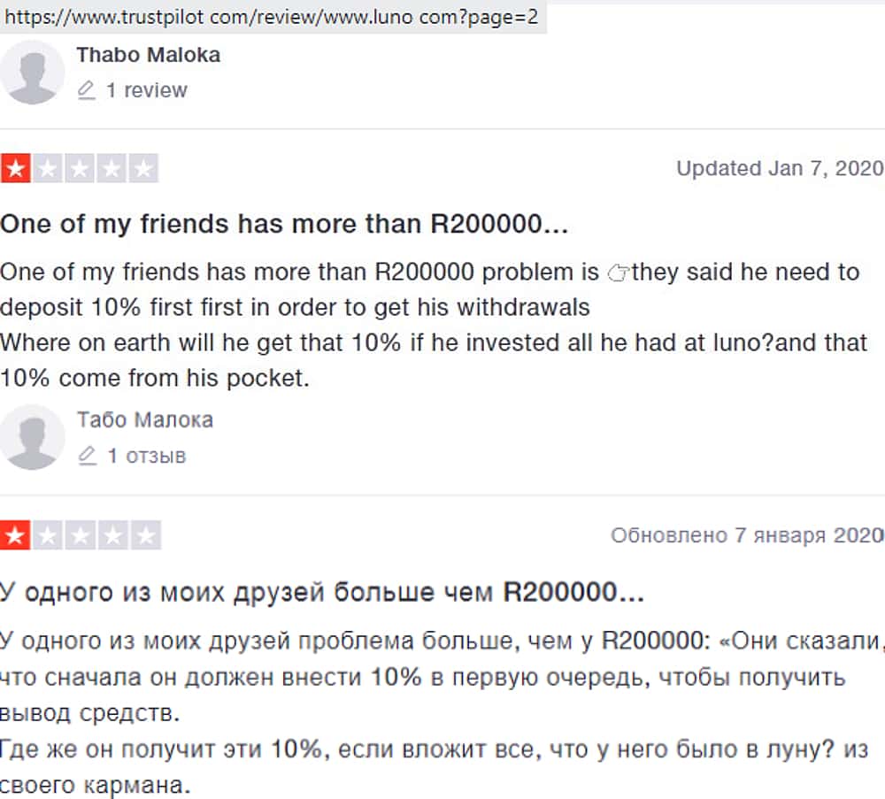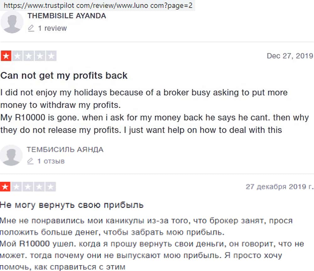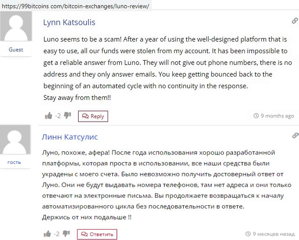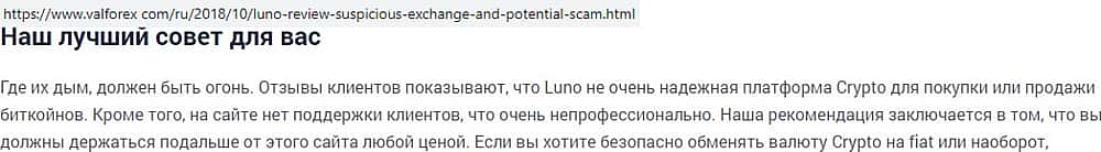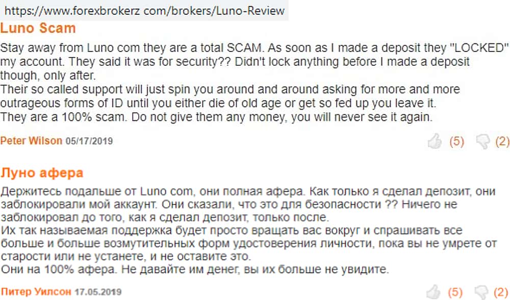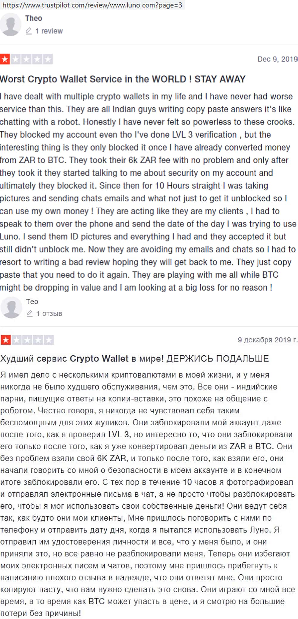 Лишнее подтверждение незаконным действиям аферистом удалось получить, правда на своем на горьком опыте, пользователю сайта отзывов trustpilot com. Не ожидала жертва аферистов Luno, что после внесение ею на депозит кругленькой суммы, ее аккаунт будет быстро заблокирован на веки вечные.
