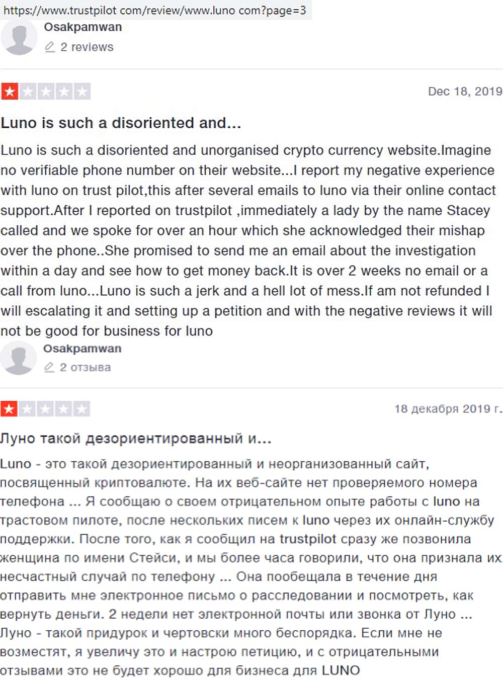 Придумывая всевозможные отмазки и дополнительные действия для своих клиентов, сборище шарлатанов Luno отказываются возвращать попавшие к ним средства. Деньги обманутых жертв оседают в неизвестном месте, и возвратить их уже будет проблематично. Это произошло с посетителем веб-сайта trustpilot com.