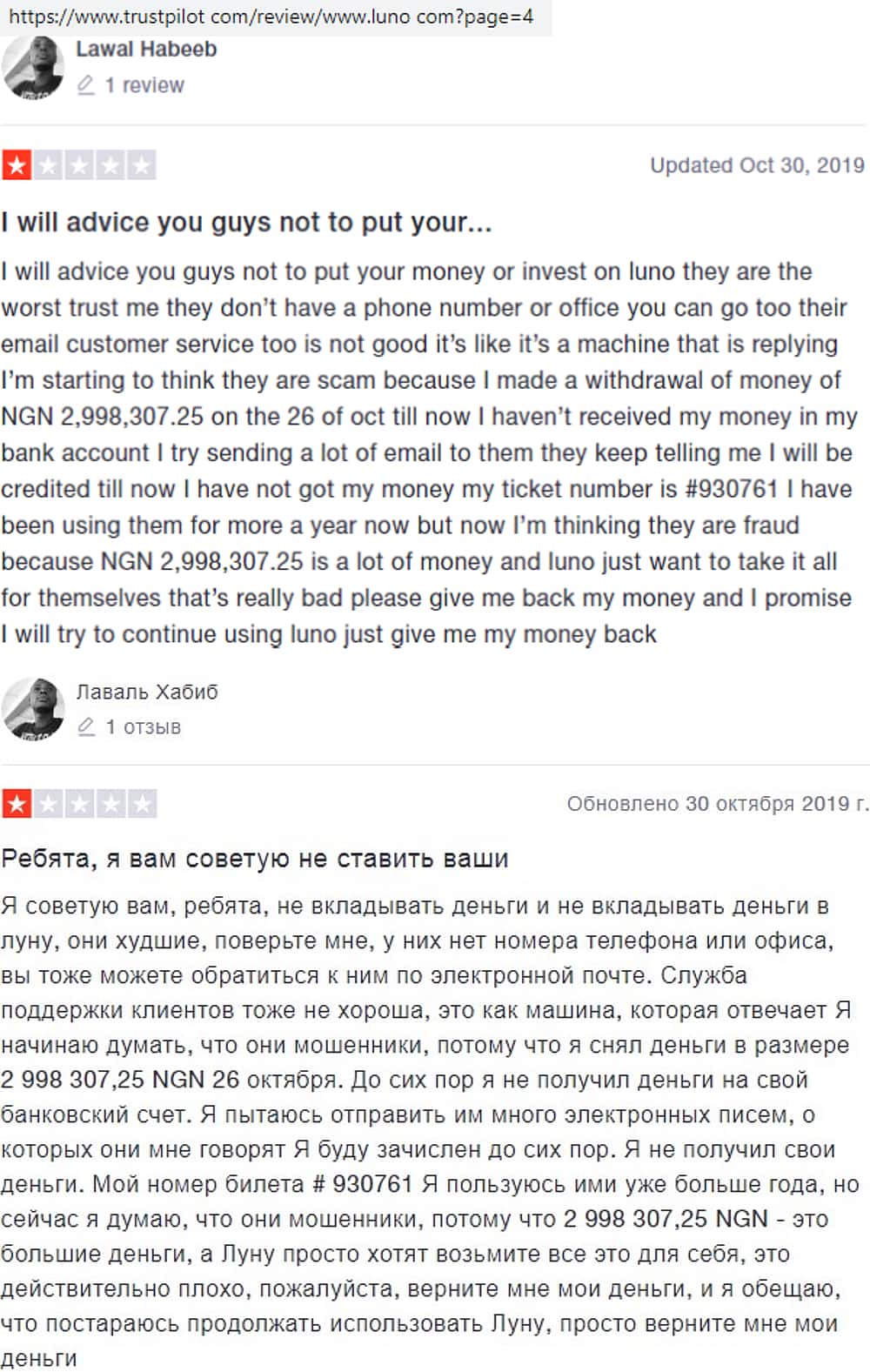 Жалобу от обманутого участника хайп-творения Luno получил независимый веб-ресурс trustpilot com. Состоит она в том, что после получения заказа на вывод своих средств, клиент их не получает, но со счета деньги уходят в неизвестном направлении. А может их даже и не заводят на депозит, а просто имитируют поступление.