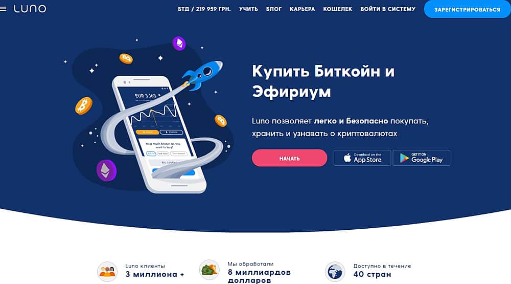 Рассмотрим главную страницу сайта-мошенника Luno. Сделана она симпатично, с претензией на легкость и доступность. Но это лишь ширма для завлечения. Бывает, что сайты, сделанные в "серьезной и профессиональной" манере, отпугивают новичков. Здесь же аферисты Luno использовали упор на привлекательное оформление.