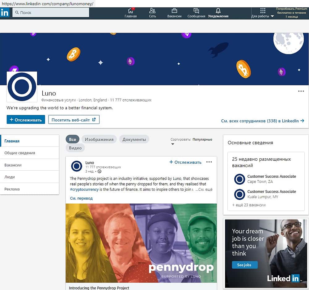 И, конечно же, как контора, которая себя представляет как международная и охватывающая уйму стран, мутная компашка Луно зарегистрировалась в сервисе для бизнесменов linkedin com. Здесь большая вероятность поиска серьезных людей имеющих деньги, а это для интернет-катал Луно как красная тряпка для быка.
