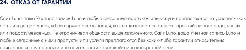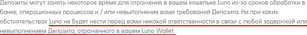 А еще в одном пункте своего антисоглашения, липовая фирма-однодневка Луно прямо указывает, что если денежка не упала на депозит, то они ни при чем. Интересно, а за что они вообще отвечают? Вот такой нехороший сомнительный сервис предлагает липовая обменка Луно. Воруют на лету и этого даже не скрывают.
