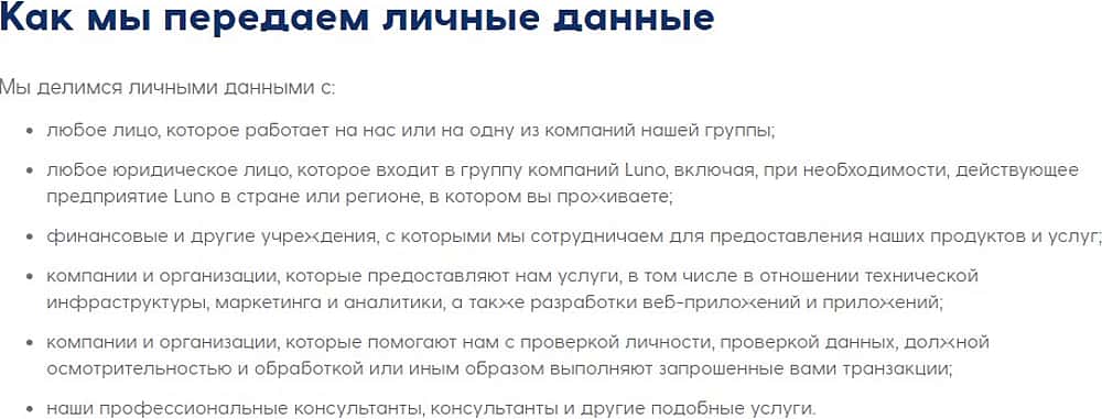 Кто же может получить доступ к личной информации клиентов? Да кто угодно. Список предоставленный на сайте жульнической группой Luno необычайно широк. Это и левые конторы-подельники, и сотрудники самого лохотрона, и некие консультанты. Последние так вообще довольно неопределенные личности.