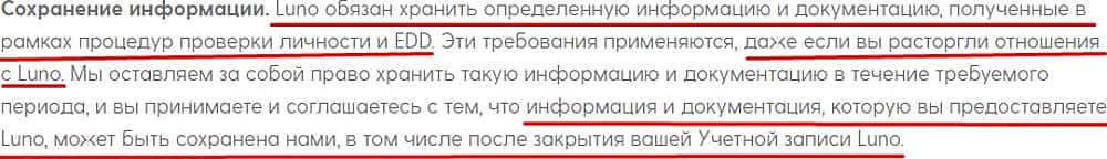 Далее вся эта информация якобы хранится у них. Но далее следует примечание, в котором скам-компания ставит перед фактом, что когда вас бортанут - а это обязательно случится - то ваши личные данные останутся в полном распоряжении злоумышленников Luno на неопределенный срок, что само по себе очень опасно.