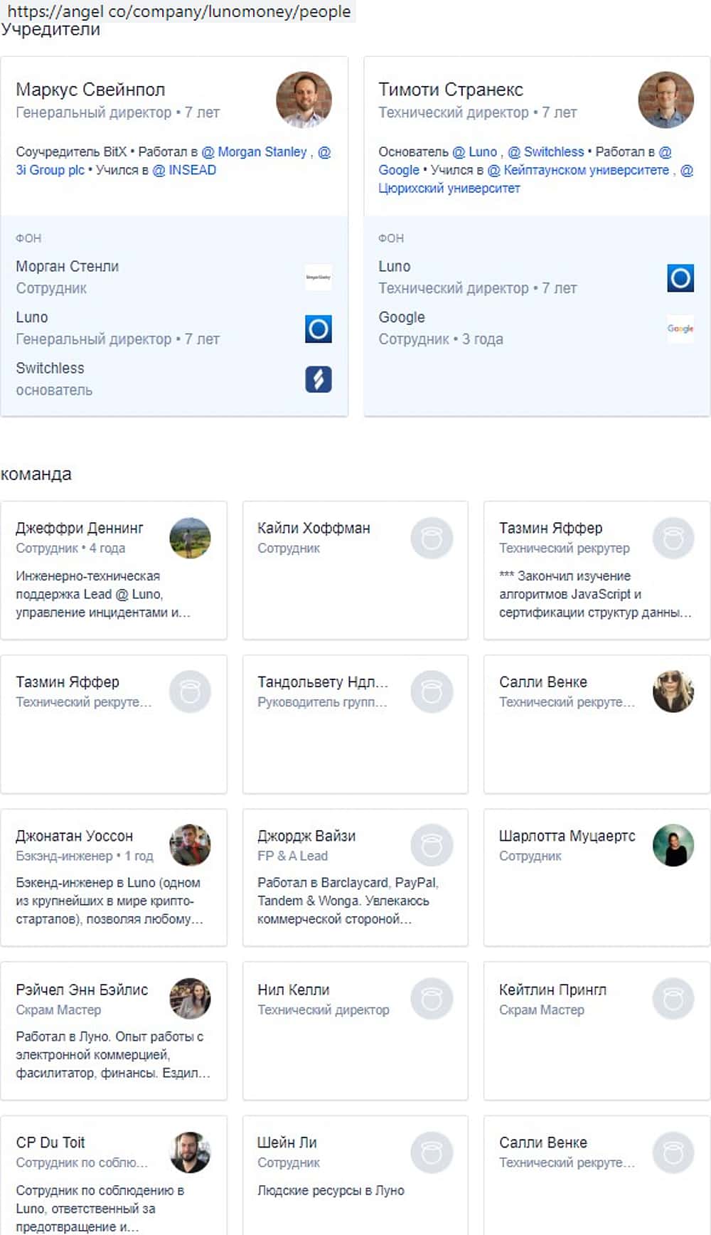 Кто же стоит у руля аферы по обману наивных пользователей Луно? Они не скрывают имен и лиц, но могут оказаться и просто подставными фигурами в темной схеме обмана. В социальной сети Linkedin указаны 338 сотрудников. На сервисе стартапов angel co удалось выделить костяк преступной группы Луно. Вот они: