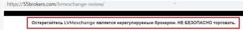 На одном из специализированных англоязычных сайтов о брокерских компаниях, кухонную организацию ЛВМ Эксчэндж не рекомендуют всем ее потенциальным клиентам, так как этот ДЦ такой же псевдоброкер как огромное количество мошенников-форекс, ныне работающих на территории России. LVMExchange никем нерегулируемый брокер - торги на внебиржевом рынке с данной конторой приведут лишь к потере депо.