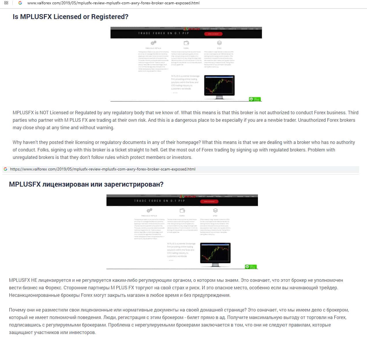 Касательно лицензии лохотрона MPlus FX - здесь также нечего сказать, потому что нет информации, что они регулируются хоть каким-то органом. Скорее всего лицензии просто нет и они используют свою конторку на лоха. Люди, которые не шарят вообще в трейдинге и инвестициях, могут повестись на уговоры менеджеров-разводил.