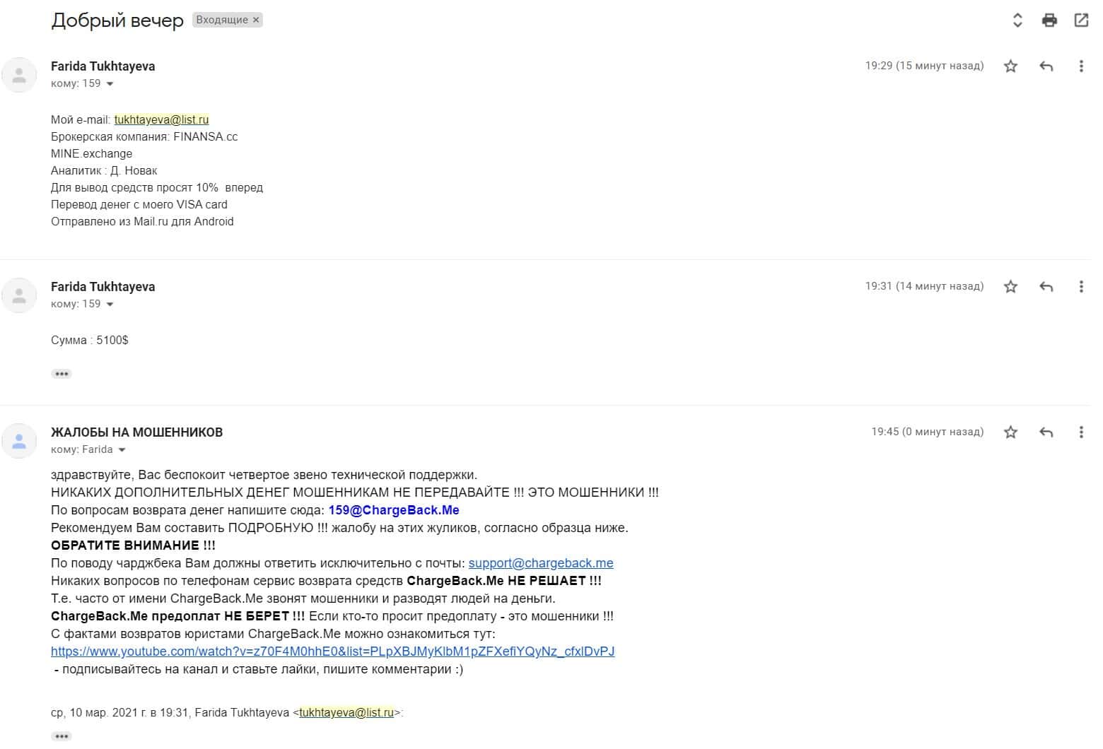 Далее предлагаем ознакомиться с первоочередной и подробной жалобой о мошеннической организации Майн Эксчендж, которая совместно с Финанса кинули клиента на 5100 долларов.