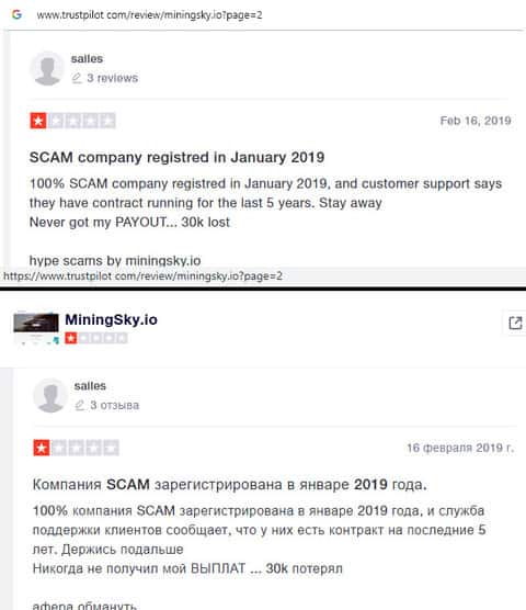 Скамерская контора MiningSky на самом деле зарегистрирована в январе 2019 года и никак не тянет на 2 года успешной работы. Таким образом, контракты на 5 лет, отзывы и прочая ерунда это лишь пиар, на который должен повестись лох и оставить там деньги. Вот как пример, человек лишился 30 000 долларов.