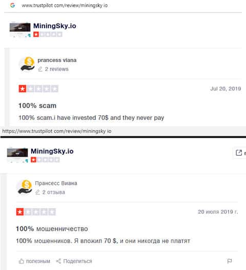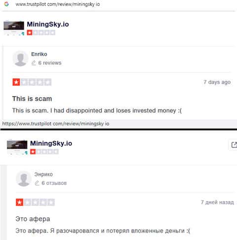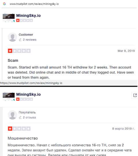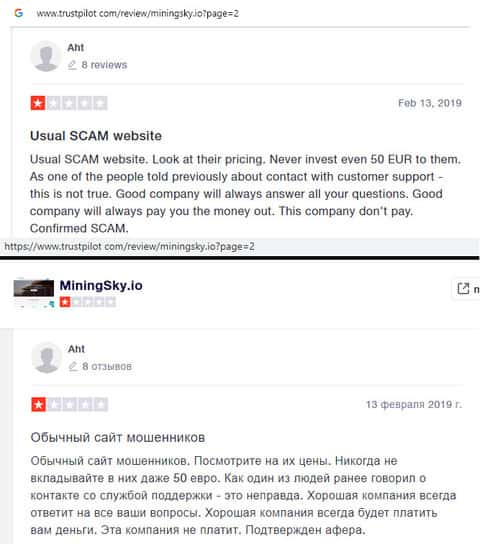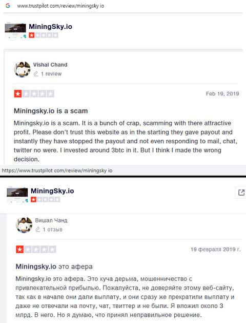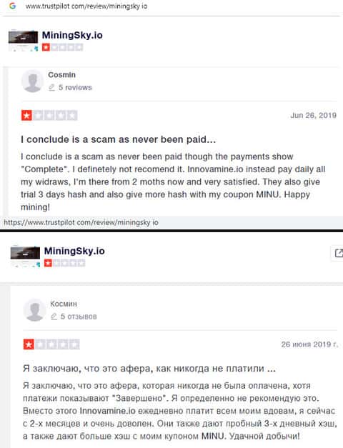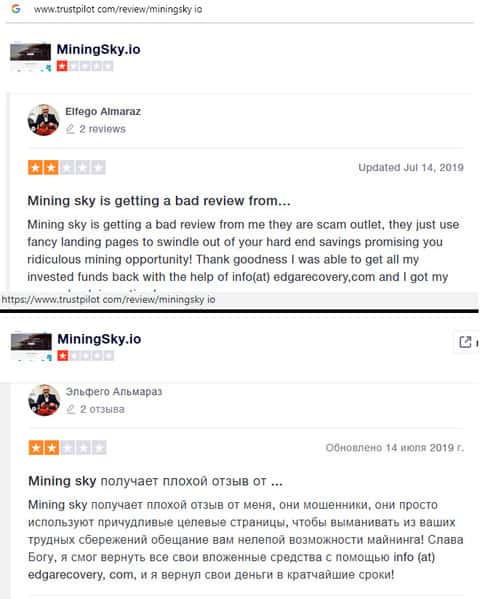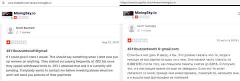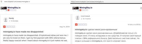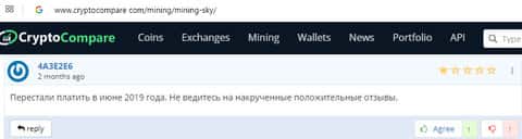 В данном отзыве человек рассказал свое наблюдение, так как сам стал жертвой лохотрона MiningSky. Так вот мошенники выставили на показ накрученные положительные отзывы и помимо этого, перестали платить с июня 2019 года. Лучше всего не связываться с этими лохотронщиками.