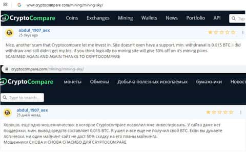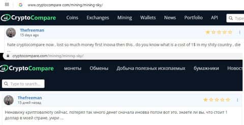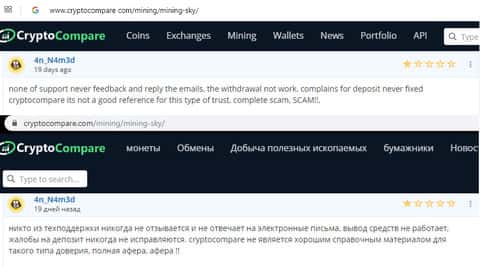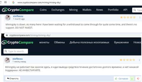 Следующий отзыв рассказывает нам как человек взял и влез в криптовалютный хайп Майнинг Скай, хотя на самом деле сначала думал, что покупает мощности для майнинга. Он пытался вывести обратно прибыль и вложенные деньги, но все попытки напрасны, как и 100 писем в службу поддержки.