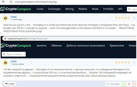 На этот раз человек просто расстроен таким положением вещей, когда контора-мошенник, такая как Майнинг Скай пиарится за счет различных ресурсов. Понятное дело, что они проплатили деньги, но тогда какое доверие может быть. Это отталкивает пользователей интернет-ресурса, так как они начинают страдать от деятельности MiningSky.
