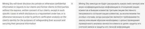В документе о политике конфиденциальности контора Mining Sky противоречит сама себе, потому что сначала говорит о том, что не будет разглашать данные о клиенте, а потом все же ссылается на какие-то исключения и уже, исходя из этого, нести ответственность за разглашение информации не будет.