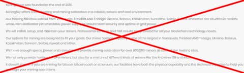 Автор отзыва рассказал очень важную информацию, которую можно использовать против лохотрона MiningSky в суде. Жулики нарушили несколько законов об авторских правах на своем интернет-сайте, а также заставляют поверить, что они связаны с другим майнинговым центром. Все это фикция для самопиара.