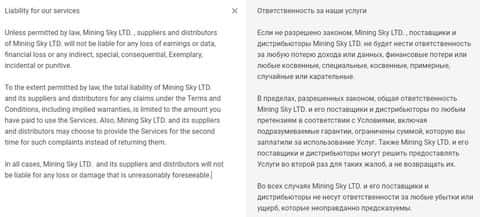 Все что нужно знать о договоре мошенников Майнинг Скай, так это то, что контора не несет ответственность за убытки, которые может понести клиент, сотрудничая с ними. Таким образом они увиливают от закона, списывая все на непредвиденные обстоятельства, а также ссылаясь на не регулирование криптовалютного рынка.