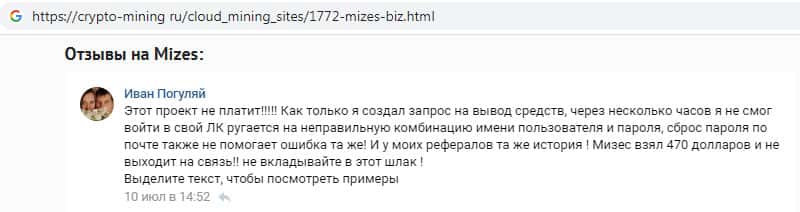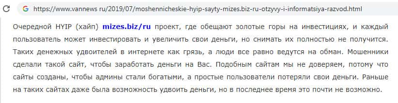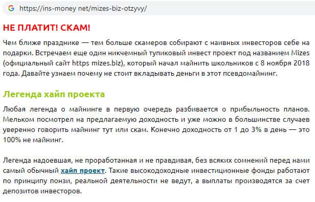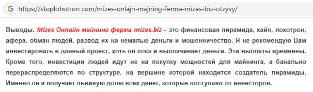 На веб-ресурсе stoplohotron com о финансовой пирамиде Майзес написано, что выплаты данной компанией производятся до тех пор, пока клиент ни начнет им верить и начнет вкладывать больше денежных средств. Скам-контора Mizes неплохо зарабатывает на наивных и ленивых пользователях интернета.