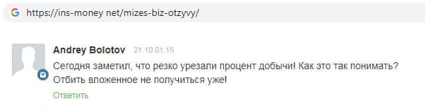 Об аферистах Mizes много негативной информации в интернете. Например отзыв, скриншот которого предоставлен ниже. На сайте ins-money net некий Andrey пишет, что отбить вложенное просто нереально. Видимо пользователь сильно пожалел, что связался с мошенниками Майзес, поэтому написал данный отзыв.