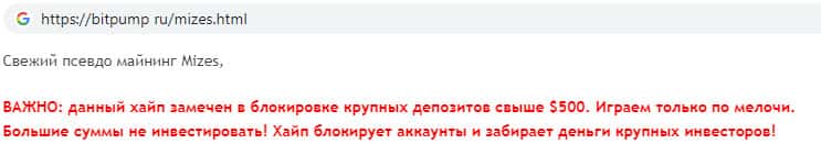 Хайп-проект Mizes был замечен в блокировке крупных депозитов свыше 500 долларов. Подтверждением тому является отысканная нами информация, которая взята с сайта bitpump ru. Данный мошеннический проект блокирует аккаунты и забирает денежные средства у крупных инвесторов.
