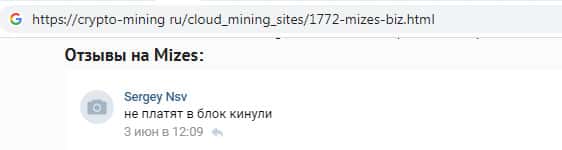 На веб-ресурсе crypto-mining ru найден комментарий пользователя, который повелся на мошеннические уловки скам-конторы Mizes и начал с ними работать. В итоге его просто напросто заблокировали без всяких на то причин и соответственно не вернули ему вложенные денежные средства.