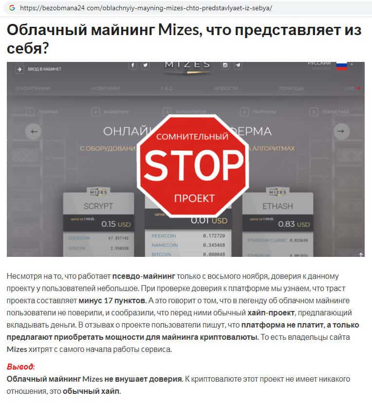 На сайте bezobmana24 com была замечена статья о мошенничестве скам-организации Mizes. Судя по всему данный сомнительный и очень подозрительный проект не заслуживает доверия, потому что данный псевдо-майнинг работает только в пользу конторы Майзес.