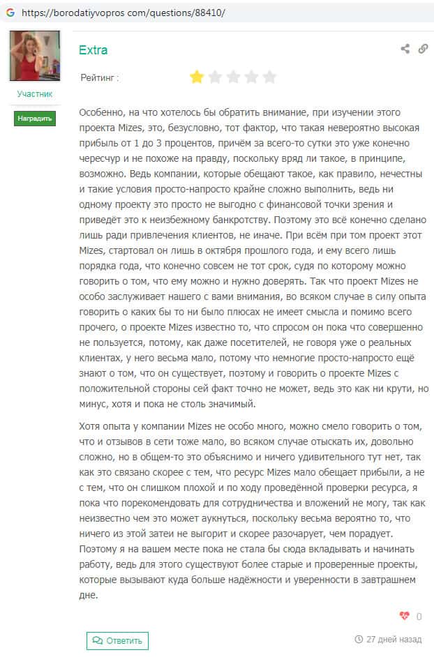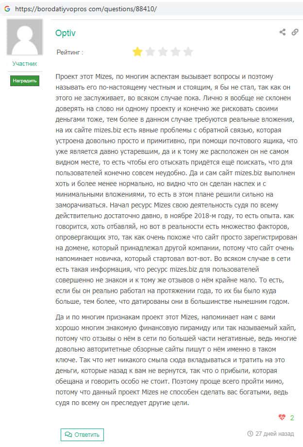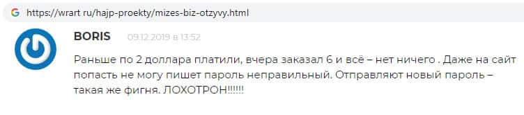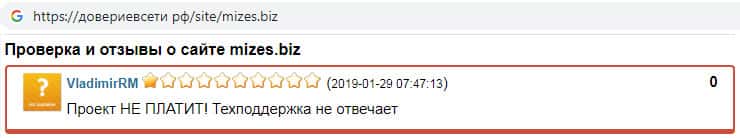 Доверять свои денежные средства мошенническому проекту Mizes нельзя. Очередным подтверждением тому является пользовательский отзыв, который был обнаружен на веб-сайте borodatiyvopros com. Автор отзыва разочаровался в подобных проектов, поскольку существует проблема с обратной связью на сайте.