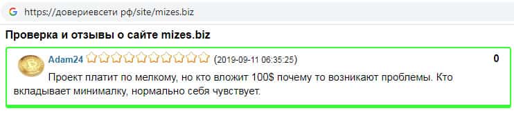 На веб-сайте довериевсети рф некий Adam24 оставил свой комментарий, благодаря которому выяснилось, что скам-компания Mizes платит только лишь сначала, чтобы заманить в свою контору, а так же только тем, кто делает маленькие первоначальные взносы. В том случае если взнос превысит более 100 долларов, могут возникнуть проблемы.