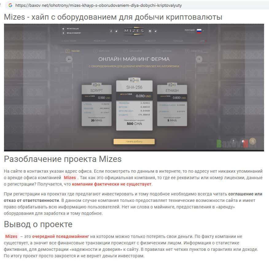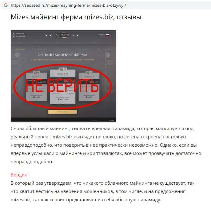 На веб-ресурсе seoseed ru была найдена статья о майнинговой ферме Mizes, которая на самом деле является очередной финансовой пирамидой, которая как правило долго не продержится. Майнинг криптовалютой - это сказки конторы Майзес и не более того. А кто верит в эту лажу, в итоге остается ни с чем.