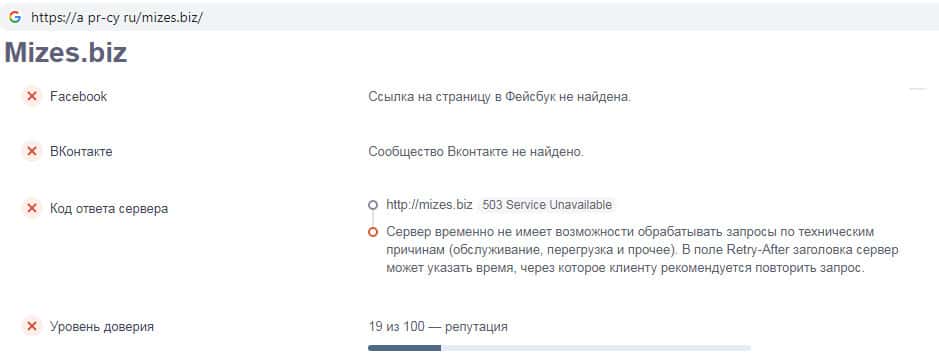 На веб-сайте a pr-cy ru производилась проверка сайта аферистов Mizes. Оказалось, что ссылки на социальные сети на сайте жуликов Майзес не работают, в частности на страницу в Фейсбуке, а так же Вконтакте. К тому же уровень доверия к сайту мошенников ниже среднего, что является признаком очередного интернет-лохотрона.