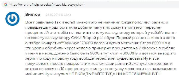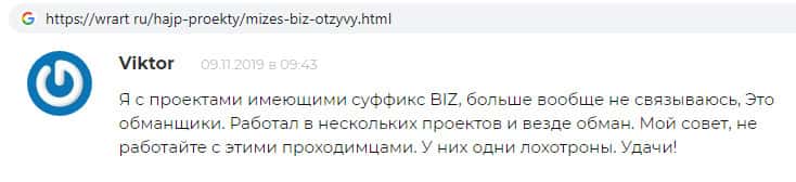 Некий Victor поделился своим мнением об организации Mizes на веб-ресурсе wrart ru. Пользователь утверждает, что связываться с этой компанией нельзя по той причине, что это очередной скам-проект, который врет людям, заманивая в свою контору якобы выгодными предложениями.