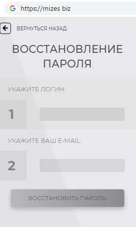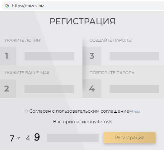 Для того, чтобы зарегистрироваться на сайте мошенников Mizes необходимо назвать логин, адрес электронной почты и пароль, и конечно же подтвердить то, что Вы соглашаетесь с условиями пользования сайтом. Прежде чем поставить галочку в данной форме, подумайте стоит ли так рисковать своими денежными средствами?