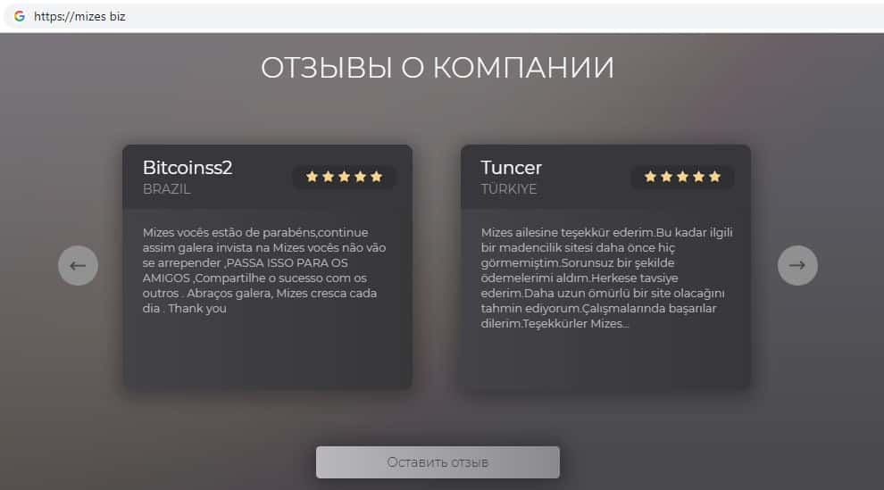 Для того, чтобы расхвалить свою организацию как можно больше, аферисты Майзес решили написать сами о себе якобы пользовательские отзывы. Данные отзывы полностью на английском языке и не имеют никакого отношения к деятельности данной хайп-конторы. Верить шуллерам Mizes не стоит !!!