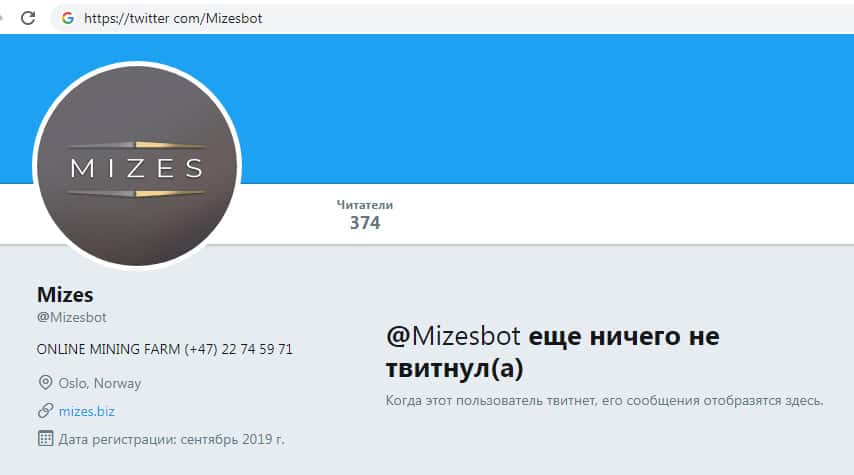 Скам-контора Mizes для привлечения как можно большего количества людей решила создать страницу в социальной сети twitter com, где мошенники позиционируют свою организацию как майнинг ферму. К сожалению жулики не предоставили никакой дополнительной информации о своей компании.