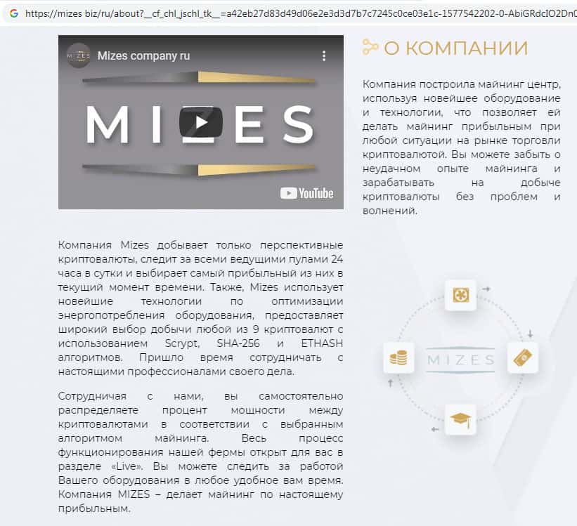 Аферисты Mizes позиционируют себя как компанию, которая построила майнинг центр, якобы используя новейшее оборудование и технологии. На сайте данной скам-организации имеется видео, которое является рекламной информацией о конторе. Так же имеется лапша на уши о перспективных криптовалютах, чтобы втереться в доверие наивных людей.