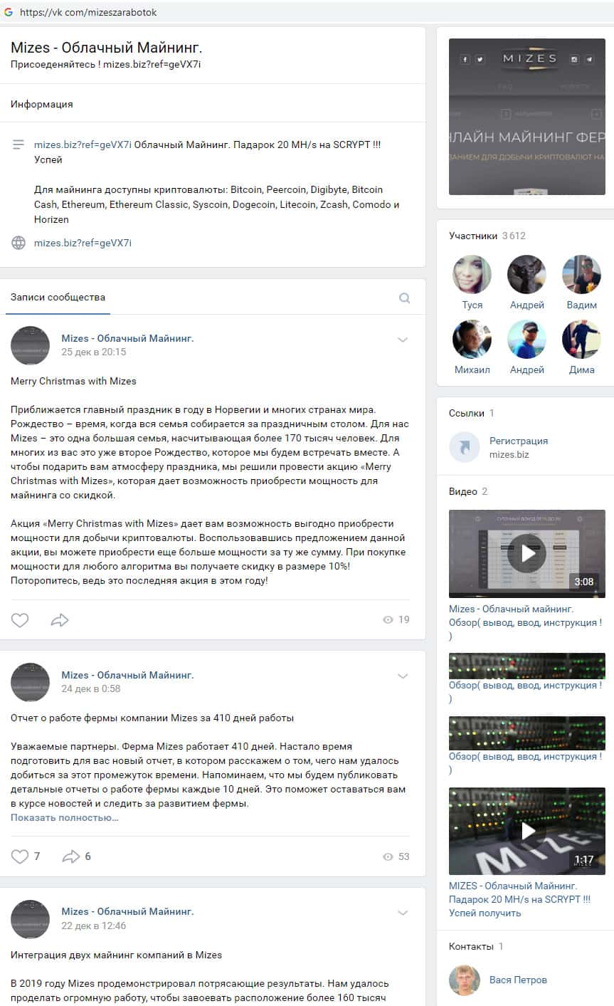 Так же у мошенников Mizes есть страница в социальной сети vk com, где конечно же имеется ссылка на их жульнический сайт. Видео о данной компании всего две штуки, а участников в их группе Вконтакте составляет меньше аж 3612 человек. А администратором их группы Вконтакте является некий Вася Петров.