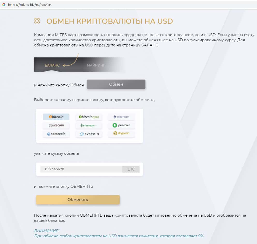 Аферисты Майзес на своем фальшивом сайте предлагают возможность обменять настоящую валюту на криптовалюту, которой на самом деле не существует, чтобы инвестировать на их сайте. Пользоваться данной функцией на сайте Mizes не рекомендуем !!!