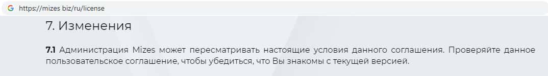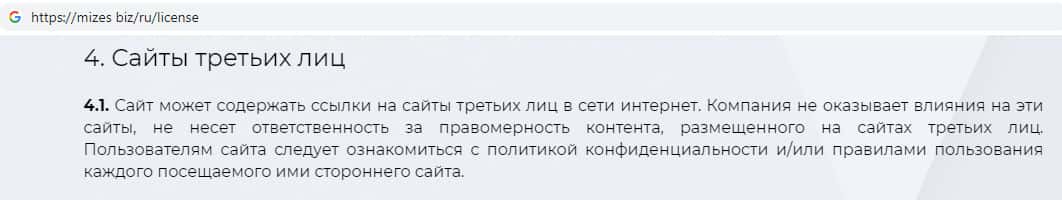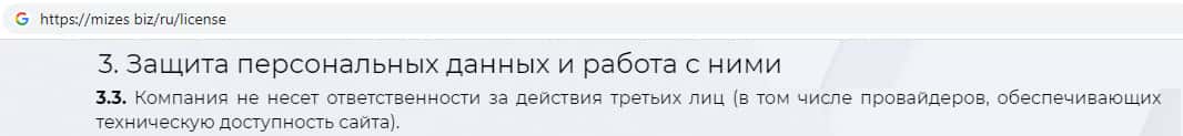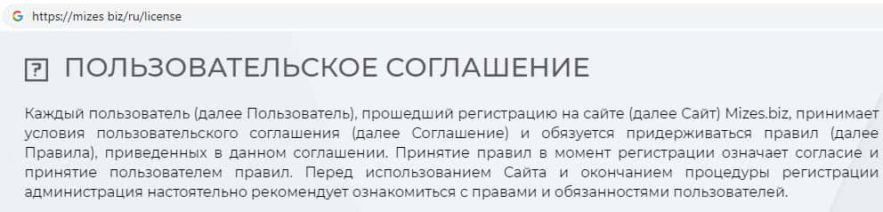 - Пользовательское соглашение на официальном сайте скам-конторы Mizes