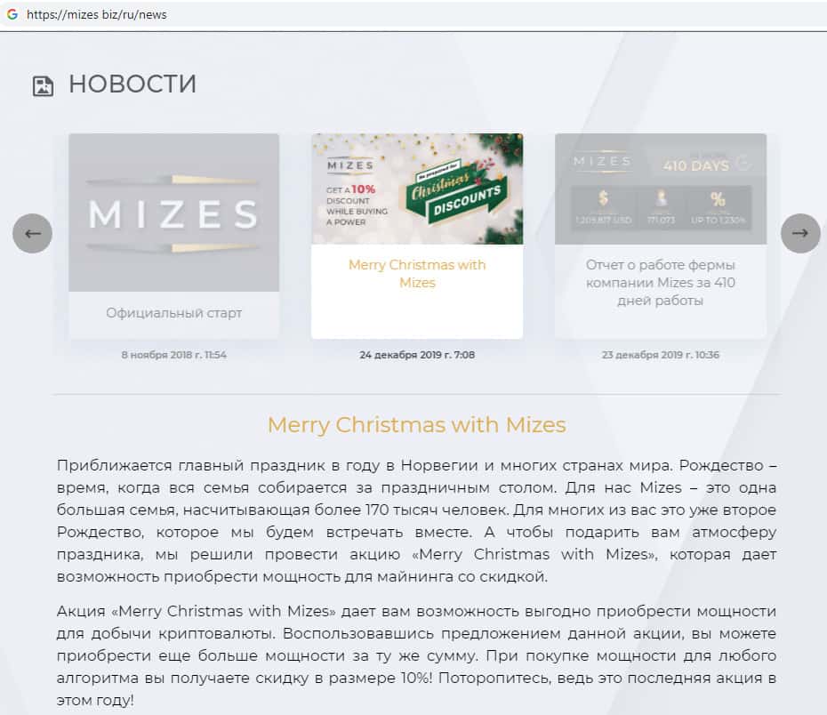 На своем официальном сайте шуллера Mizes опубликовали новости о своей компании, которые оказались малоинформативными. Мошенники Майзес обещают предновогодние скидки и многое другое, чтобы привлечь в свою контору пользователей, которые им будут верить и поведутся на развод с их стороны.