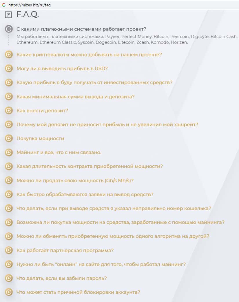 На официальном сайте жуликов Mizes были замечены уже продуманные всевозможные ответы на те вопросы, которые могут задавать клиенты, например про майнинг и все, что с ним связано. В случае возникновения каких-либо проблем связанных с выводом денежных средств, аферисты Майзес всегда будут ссылаться на предлагаемые ответы.