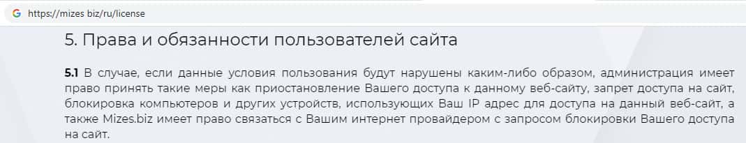Жулики Майзес уведомляют пользователей своего сайта о том, что они вправе в любой удобный им момент заблокировать пользователя, ссылаясь на то, что якобы было обнаружено мошенничество со стороны клиента, либо же попытки взлома сайта. Таким образом аферисты Mizes полностью снимают с себя ответственность за жульническую деятельность.