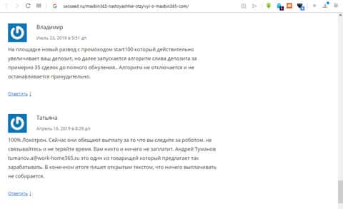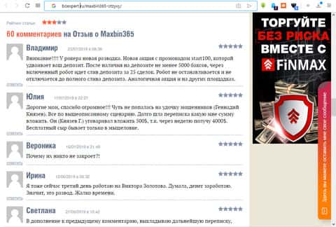 На портале boexpert ru пользователь Владимир оставил свой отклик, в котором называет контору Макс Бин 365 "разводняком". Он говорит, что это простая финансовая пирамида без каких-либо исключений. И ниже этоко отзыва присутствует множество других таких же по содержанию. Макс Ибн 365 просто сделали робота, который под видом торговли вытаскивает все деньги из карманов наивных клиентов. Люди не ведитесь на подобный лохотрон. Берегите деньги и нервы!
