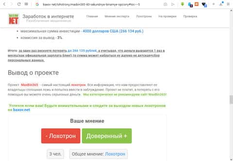 Опрос на сайте статей, разоблачающих мошенников с MaxBin365Портал binclub ru с мнением о Макс Бин 365