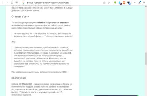 На сайте binclub ru также подробно было изучен и описан принцип работы конторы, прославившейся своими скам-действиями по отношению к своим клиентам. Автор решил сам связаться с этой компанией. Мнение последнего всё то же. Макс Бин 365 - просто воры и мошенники, которые своими прекрасными устами, с вытекающими из них лестными словами, заманивают людей для полного обнищания последних с целью обогащения самих себя!!!