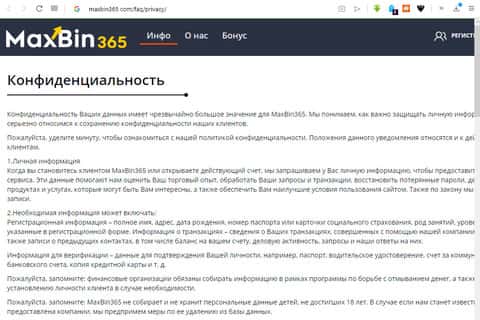 Политика конфиденциальности Макс Бин 365 или откуда у них мои данныеРиски торговли на бирже Макс Бин 365