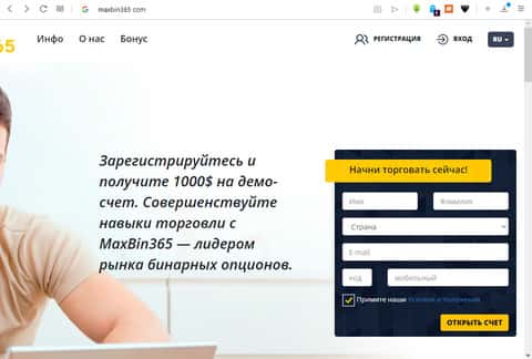 Главная страница довольна красивая и яркая. И самое первое, что мы видим, текст "Зарегистрируйтесь и получите 1000$ на демо-счет. Совершенствуйте навыки торговли с MaxBin365 — лидером рынка бинарных опционов.". Для того, чтобы уверить Вас в том, что можно стать миллионером сидя в кресле или лежа на диване. Никакой честный и надежный брокер не будет дарить вам лишних 1000$ даже на демо-счет, это всего лишь замануха для наивных.