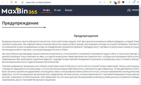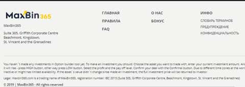 MaxBin365 - это непонятная и неизвестная контора, называющая себя лидером в сфере бинарных опционов. Забирая у них всё до последней монеты и выгоняет кочевать на улицы, путём обмана и лжи, предлагая глупым людям со сказочной наивностью и доверием, заработать много бумажек, сидя на диване и при этом всё законно и надежно, что люди даже забывают, что бесплатный сыр - в мышеловке. НЕ рекомендуем связываться с лохотроном Макс Бин 365 !!!