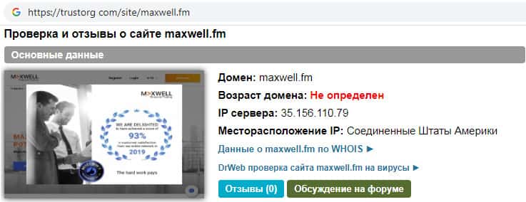 На информационном сайте trustorg com была произведена проверка ip-адреса мошеннической организации MaxWell Fm. Выяснилось, что возраст домена их фейкового сайта определить невозможно. Доверять подобным сомнительным непроверенным и не надежным псевдо-брокерским интернет-ресурсам не рекомендуем !!!