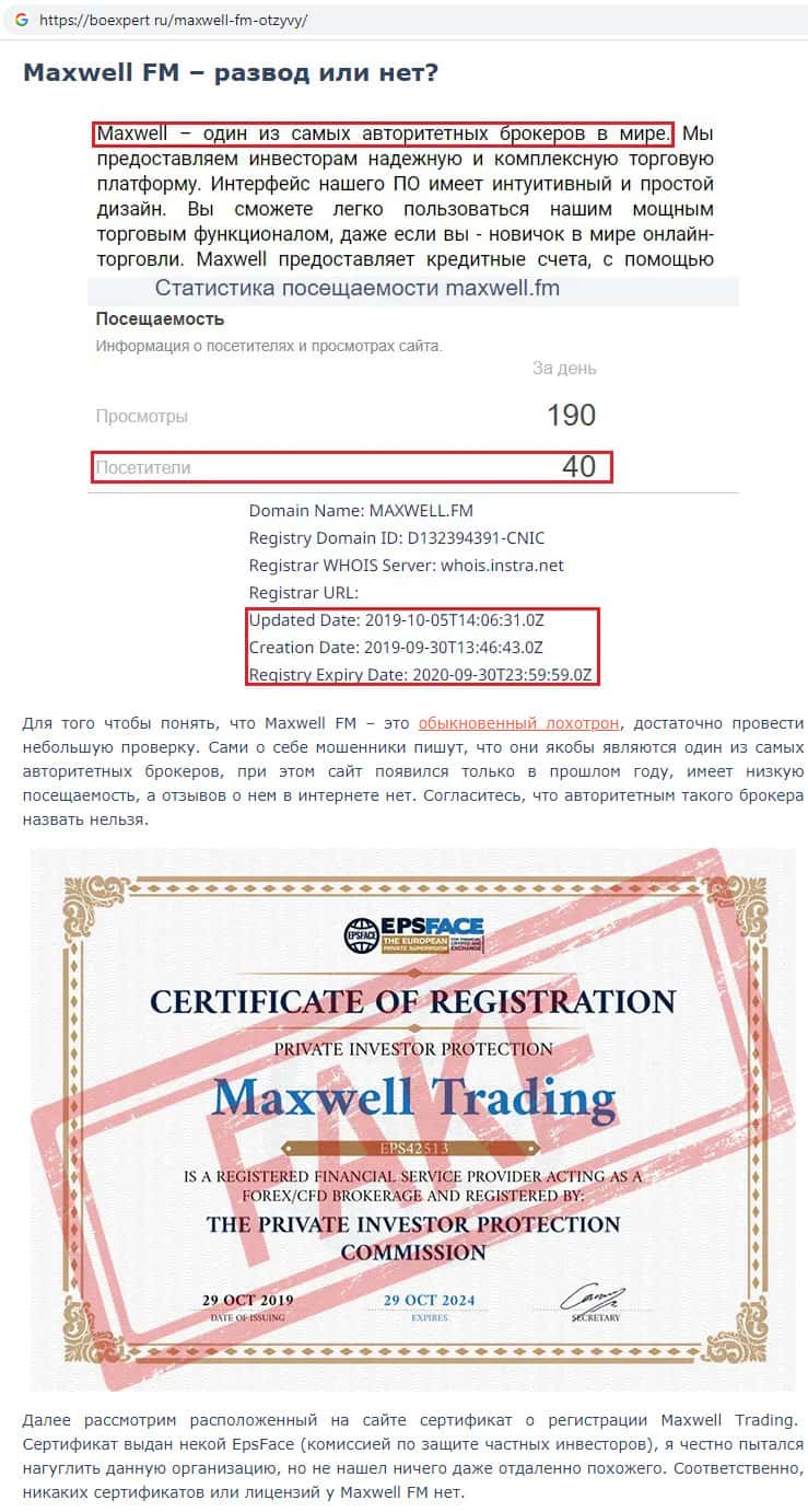 На интернет-ресурсе boexpert ru обнаружена статья о скам-проекте MaxWell Fm, который не является авторитетным брокером. Это всего лишь навсего обыкновенный интернет-лохотрон, который рассчитан на новичков. Сайт шараги имеет низкую посещаемость. Из этого следует вывод о том, что скам-организация Макс Велл не заслуживает доверия !!!